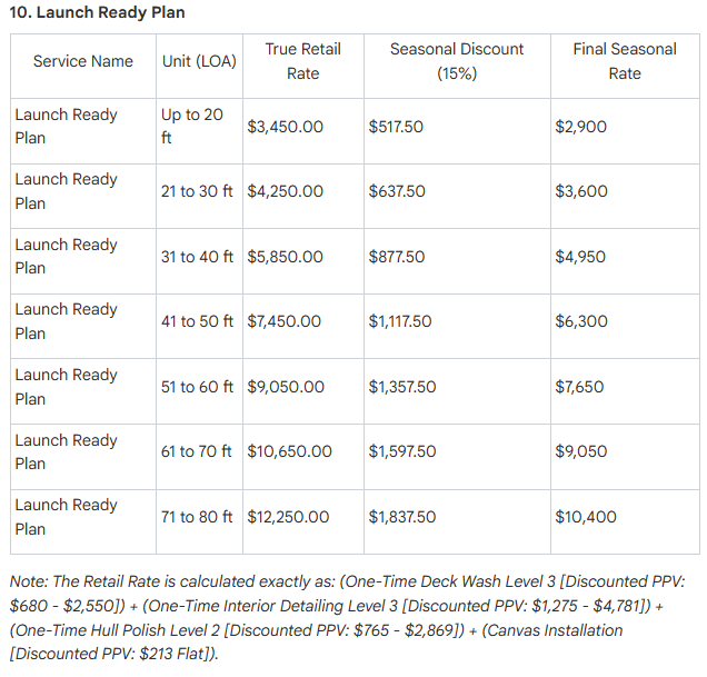 After a long off-season, your boat requires a systematic reset before hitting the water. Dust, stale air, and light oxidation naturally accumulate during winter storage. The Launch Ready Plan is a comprehensive spring commissioning detailing service engineered to prep, polish, and prime your vessel for a flawless season. This one-time package addresses the boat as a complete system. On the exterior, a Level 3 Deck Wash deeply scrubs away winter accumulation and clears lockers. Below the rub rail, we execute a Level 2 Hull Polish, utilizing medium machine compounding to remove light oxidation before applying a durable protective coating. Inside the cabin, a Level 3 Interior Detailing utilizes intensive steam cleaning to sanitize surfaces and deodorize stale air. Lastly, we carefully install your canvas systems for a proper, secure fit. Explicit Exclusions: This is not an extreme restoration package. It does not address heavy structural gelcoat failure, Level 5 wet-sanding correction, or extreme interior mold abatement. Ideal Client: Owners wanting a professional, turnkey detailing reset to launch their boating season with a clean, polished, and protected vessel. What is included in the Launch Ready Plan? It provides a complete pre-launch reset including a Level 3 Deck Wash, a Level 2 Hull Polish, a Level 3 Interior Detailing, and canvas installation. Will the Level 2 Hull Polish fix deep scratches and heavy oxidation? No. Level 2 polishing targets light oxidation and minor surface dullness. Severe oxidation and deep scratches require a Level 4 or 5 restorative polish. Do I need an in-person assessment before booking this plan? Yes. Every service requires a $250 assessment to confirm your boat's condition matches the service scope, which is fully credited toward your final quote